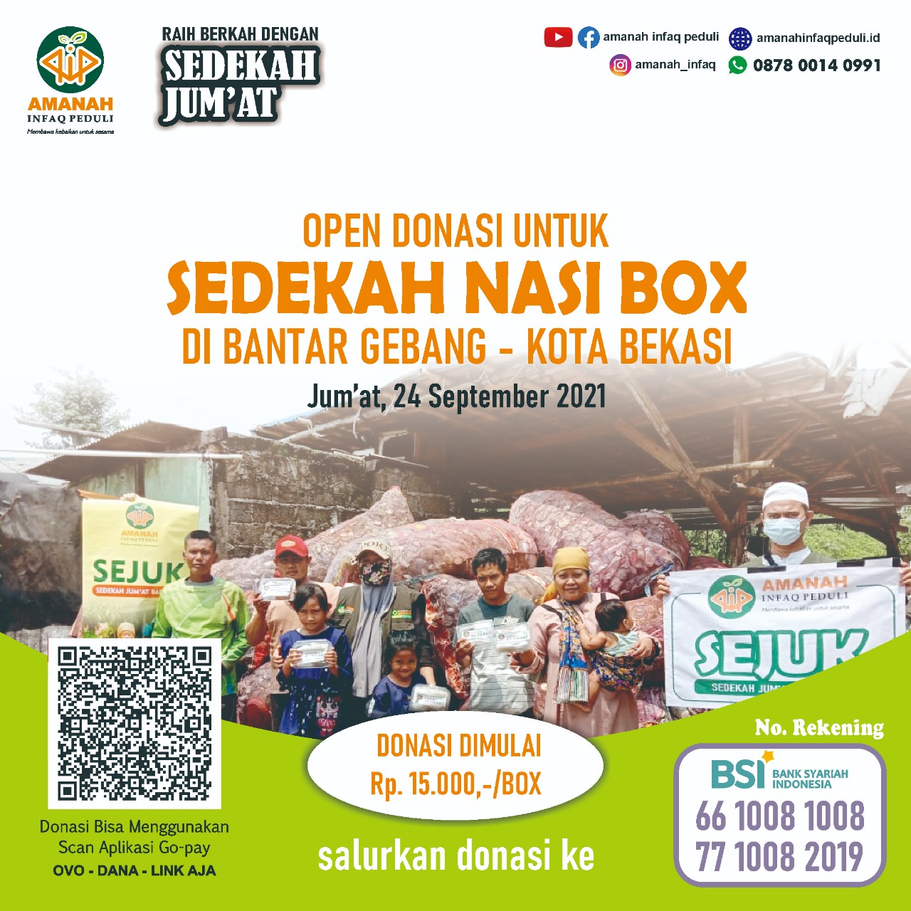 Bismillaah. Salam bahagia sahabat Amanah, dimanapun berada.. Semoga sehat selalu dan sukses dalam beraktifitas. kami kembali akan mengadakan SEJUK (SEdekah JUm'at baroKah), yakni kegiatan berbagi makanan di Jum'at Berkah Se-Kota Bekasi. Bantu ya..